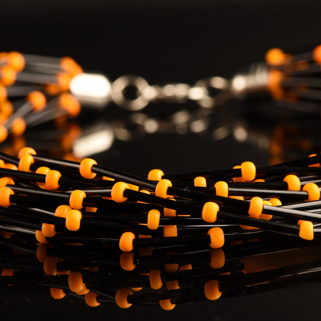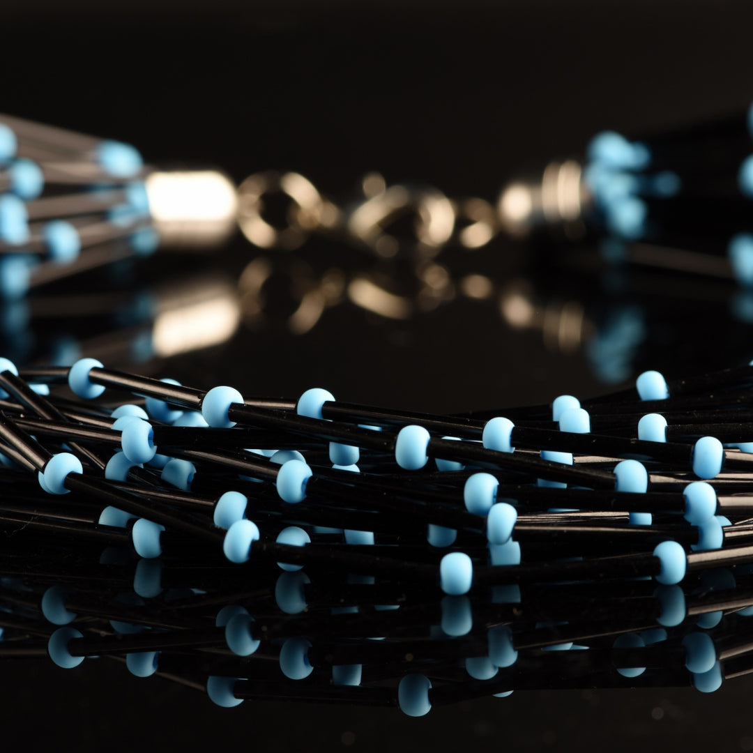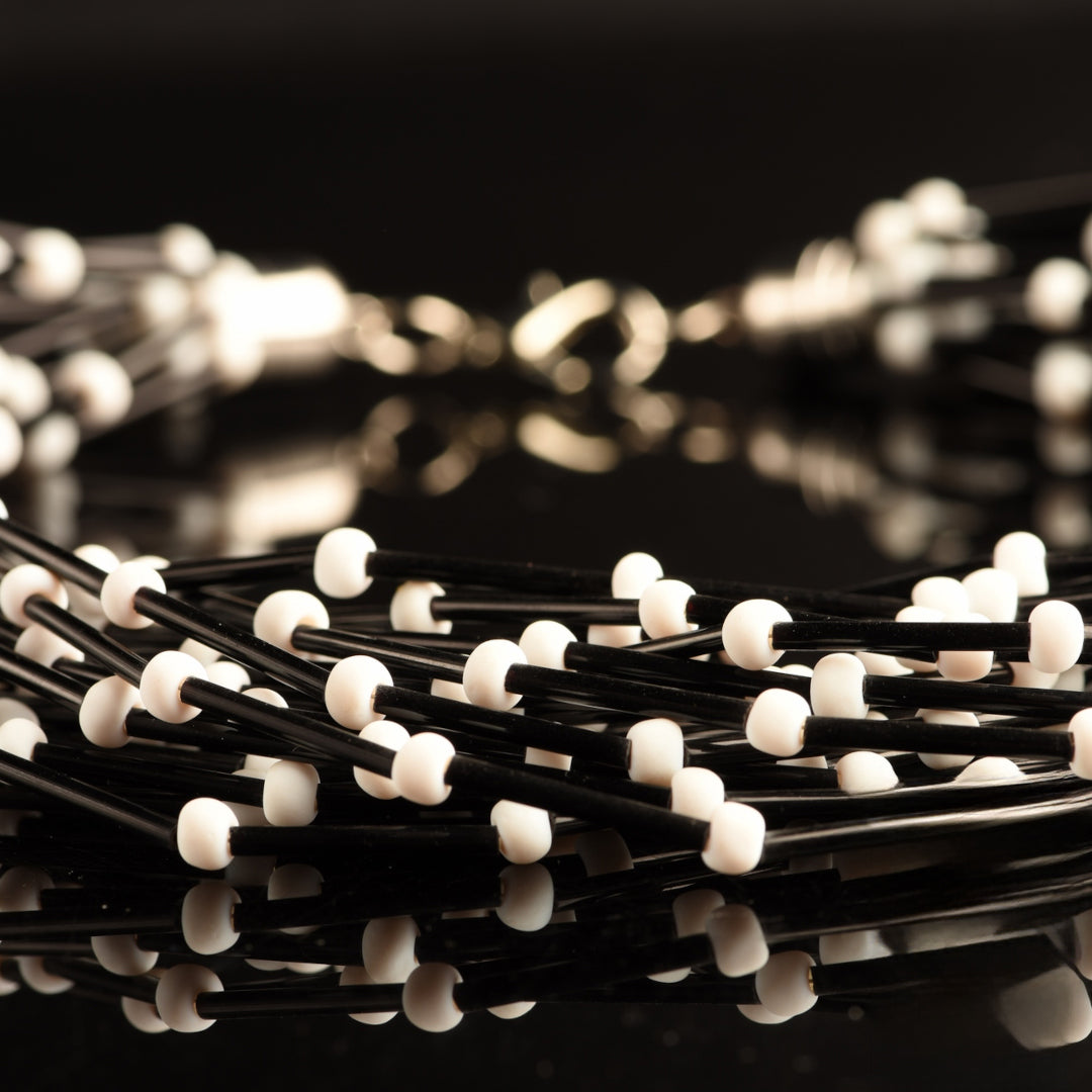 La collana si compone di 20 fili di perle di vetro nero vintage "PIVA" a forma di tubo, elegantemente intervallate da perle di vetro satinato di 4 mm. La loro rarità è inestimabile: queste particolari perle non sono più in produzione dagli anni '80, il che aggiunge un fascino storico e un valore collezionistico al gioiello.