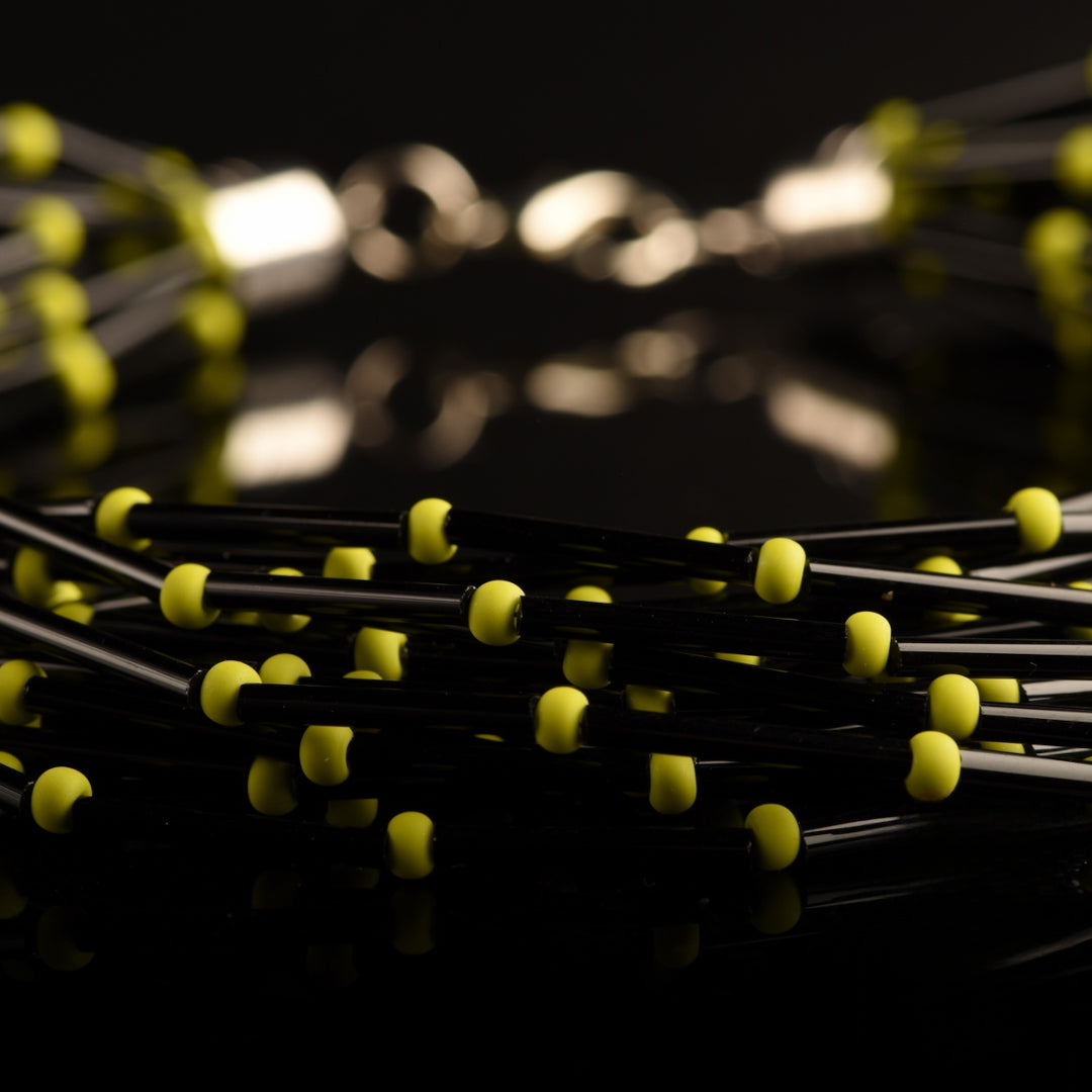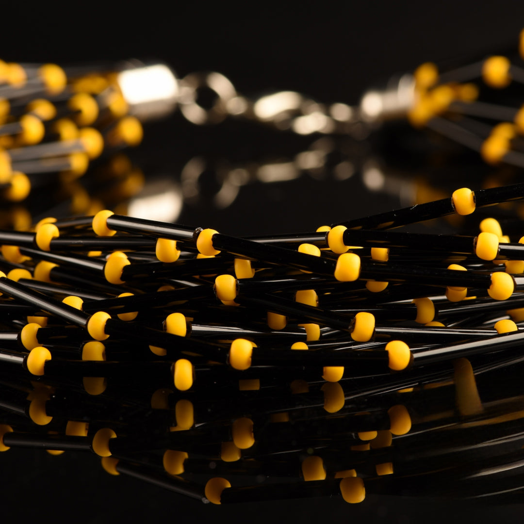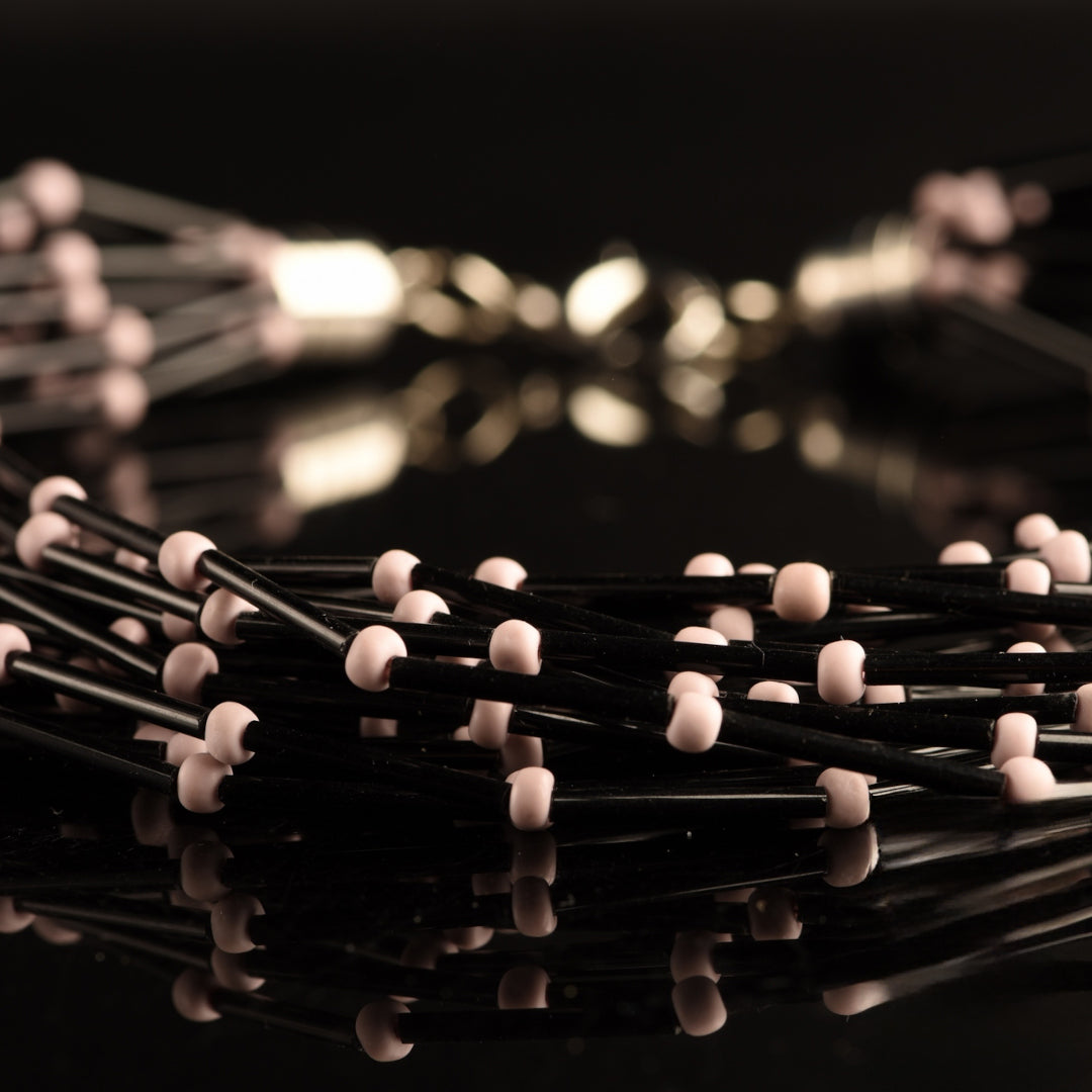 Collana Torchon Pive Mono: capolavoro di Murano, 20 fili di rare perle a tubo di vetro vintage nero e perle satinate colorate.