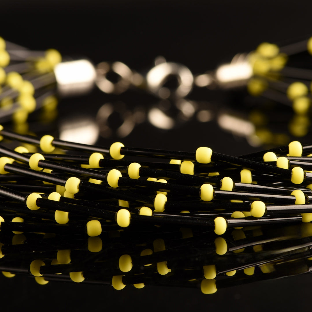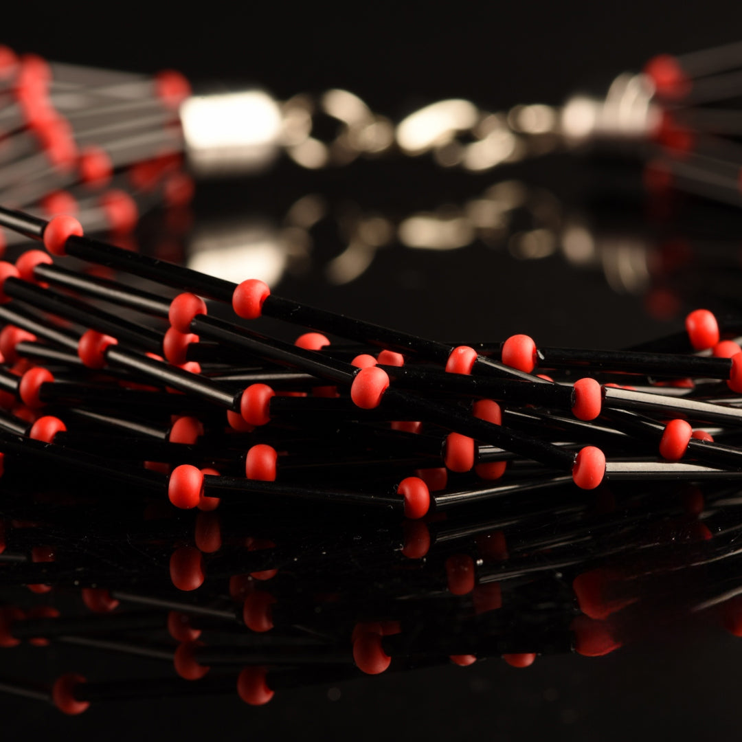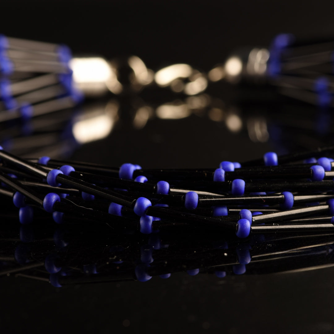 Collana Torchon Pive Mono: capolavoro di Murano, 20 fili di rare perle a tubo di vetro vintage nero e perle satinate colorate.