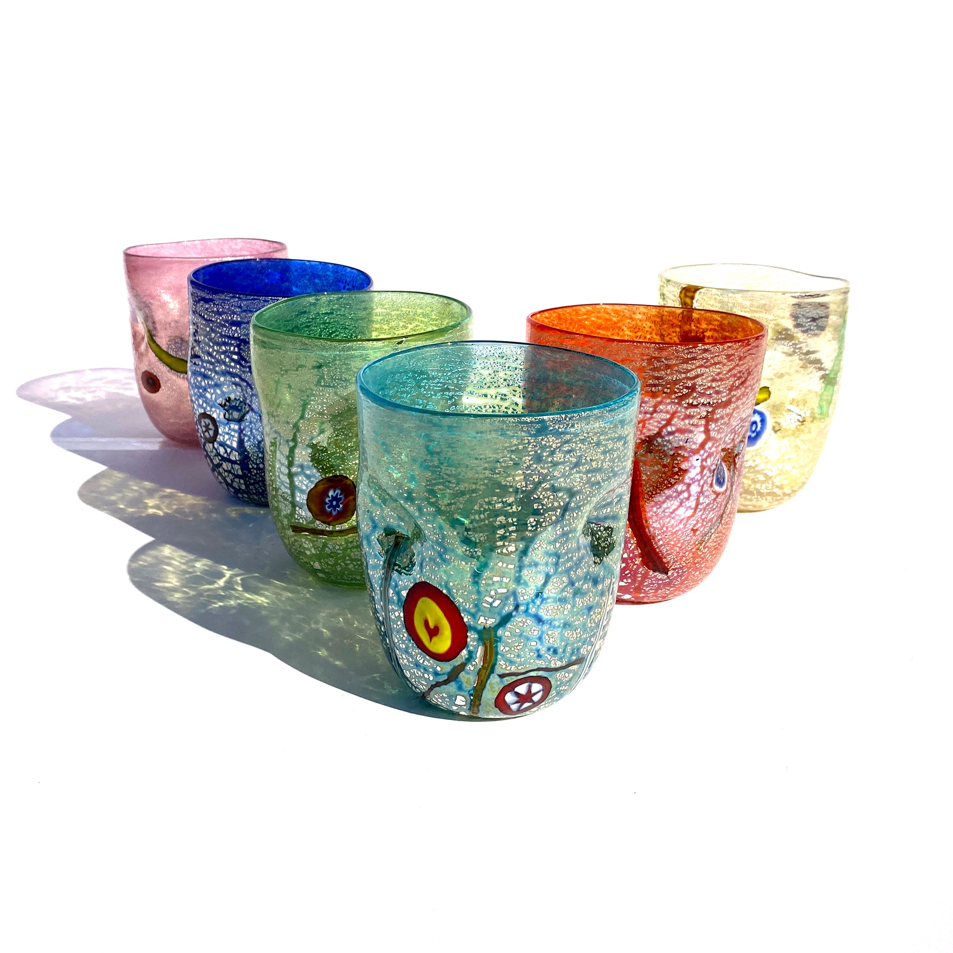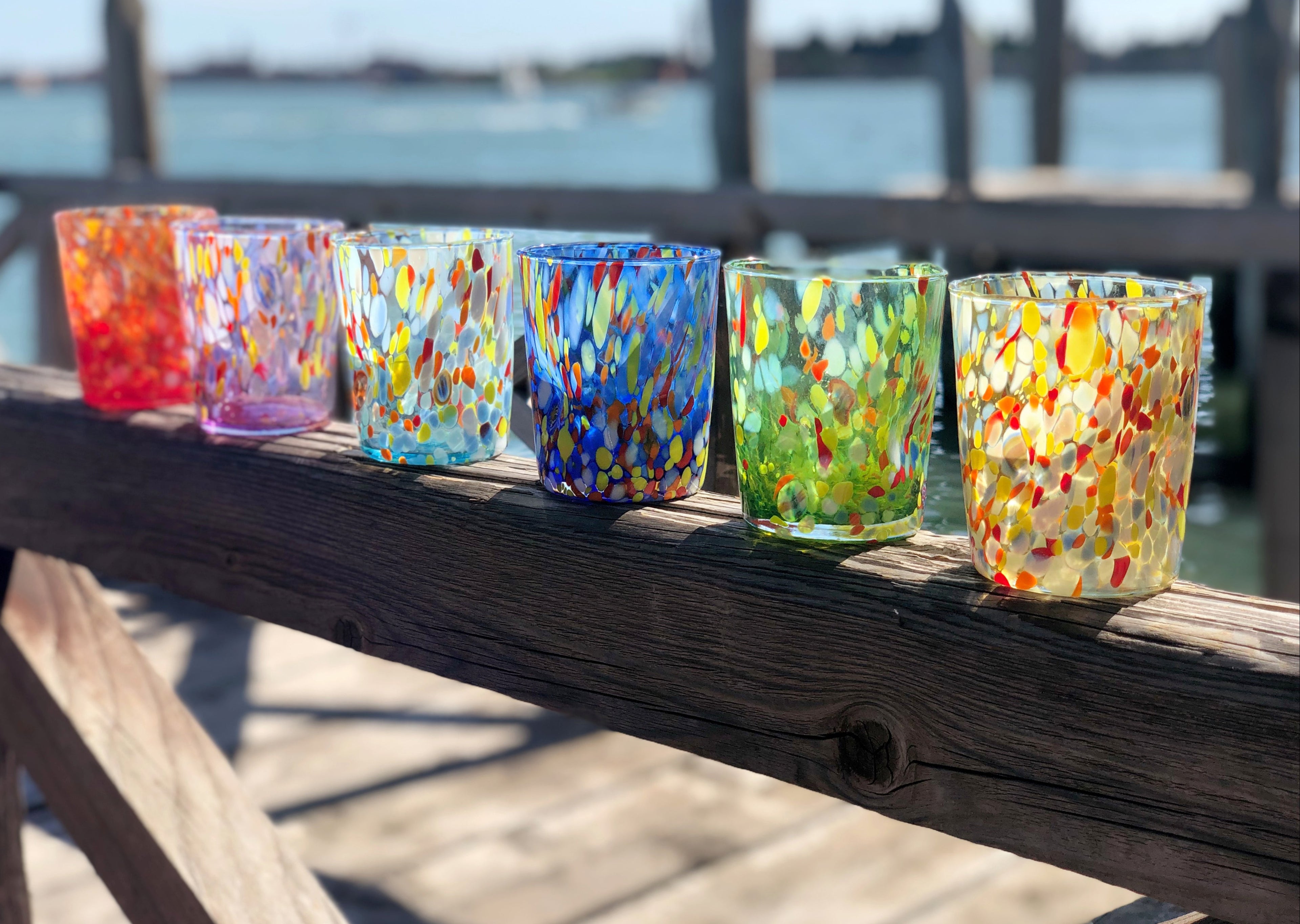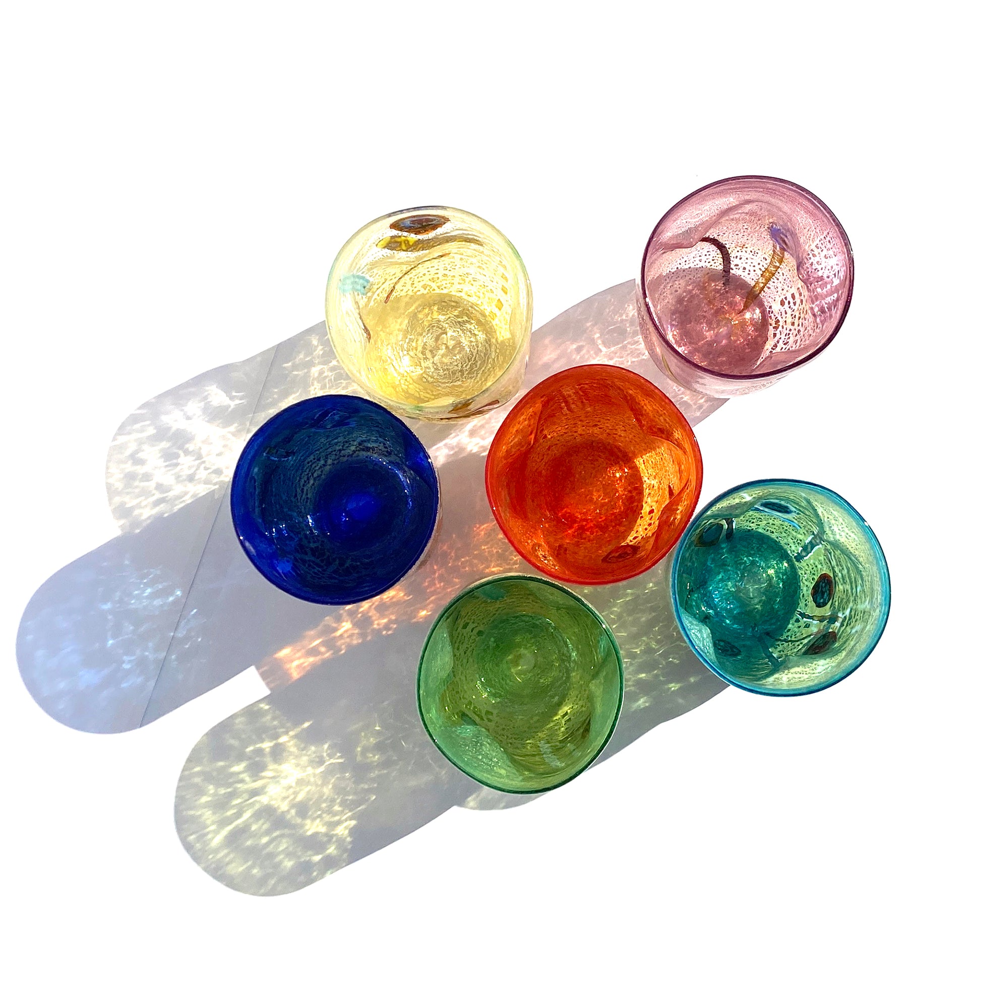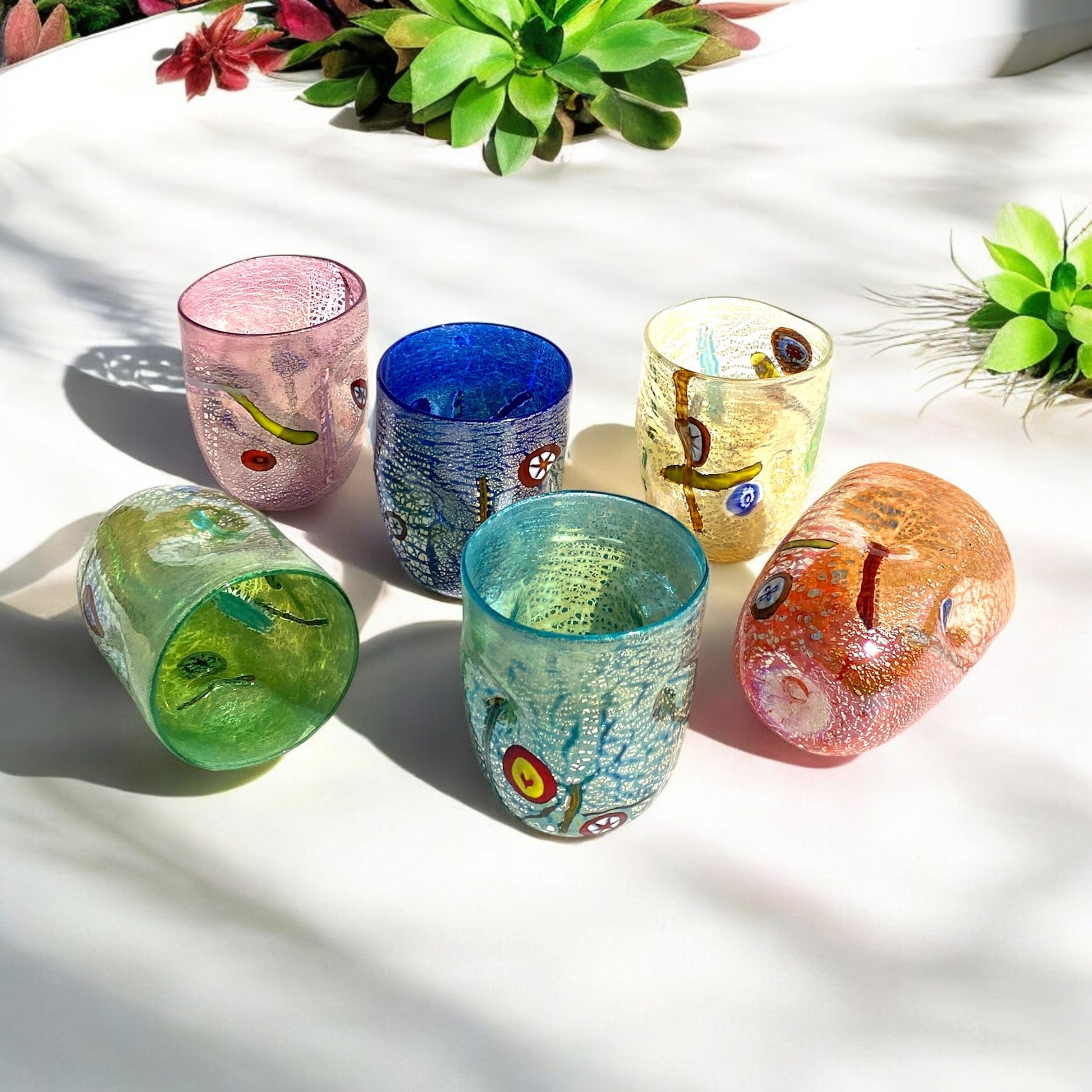 Realizzati in pregiato vetro cristallo con graniglia di vetro colorato, questi bicchieri sono arricchiti da un'applicazione di foglia d’argento che, frammentandosi delicatamente, dà vita a una costellazione di minuscoli puntini luminosi. Un effetto raffinato e poetico che rende ogni pezzo unico e affascinante.