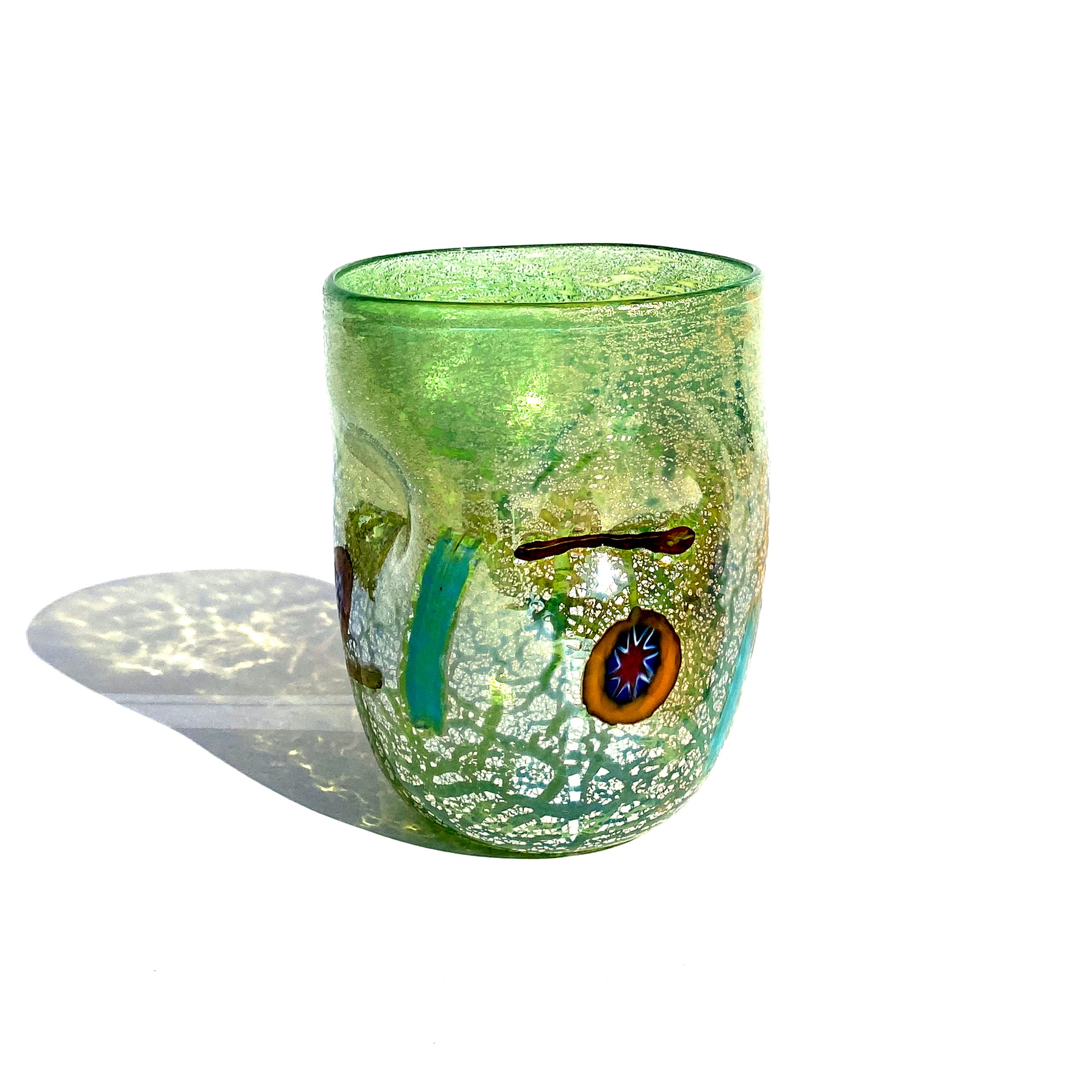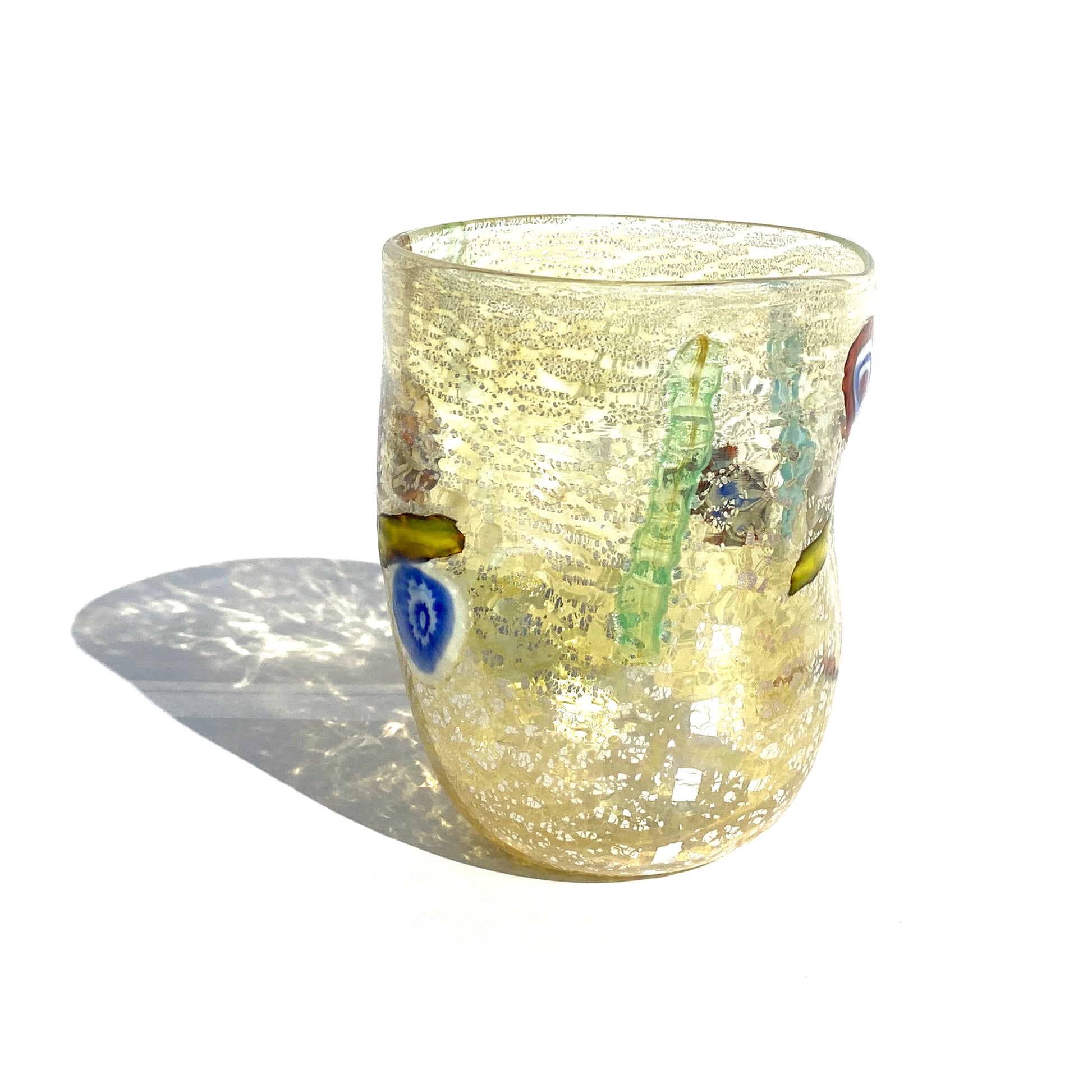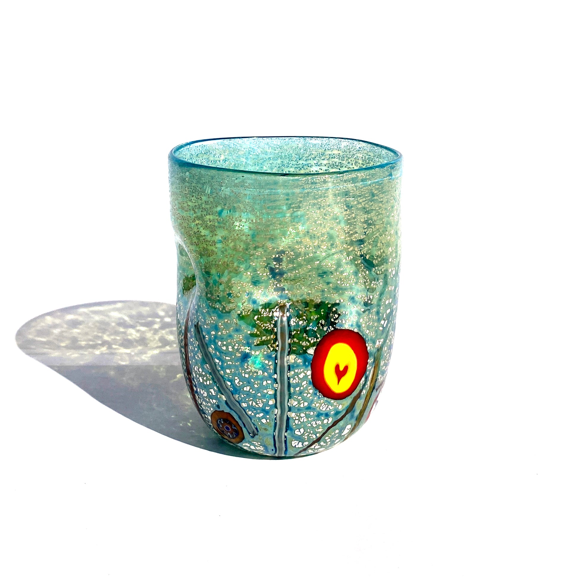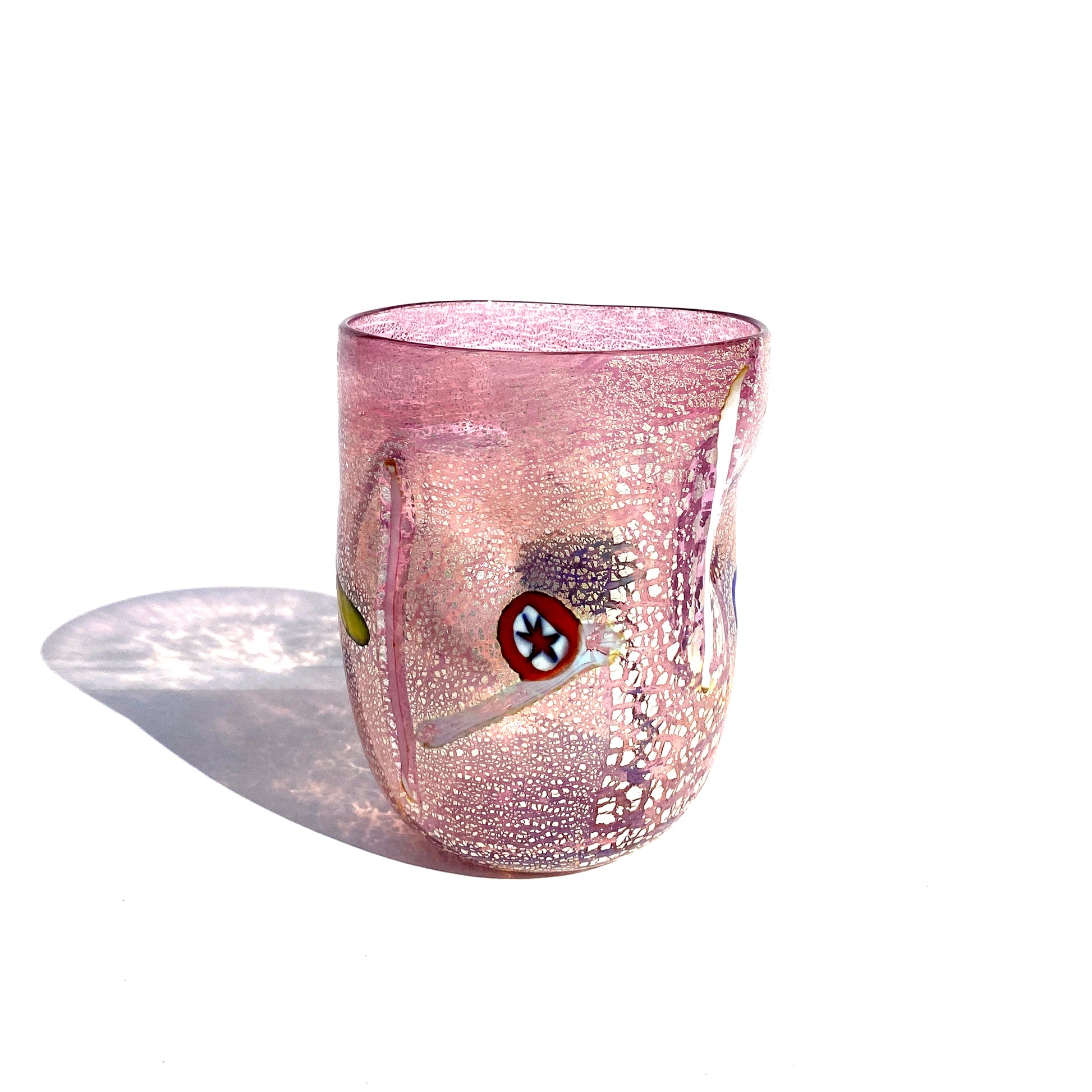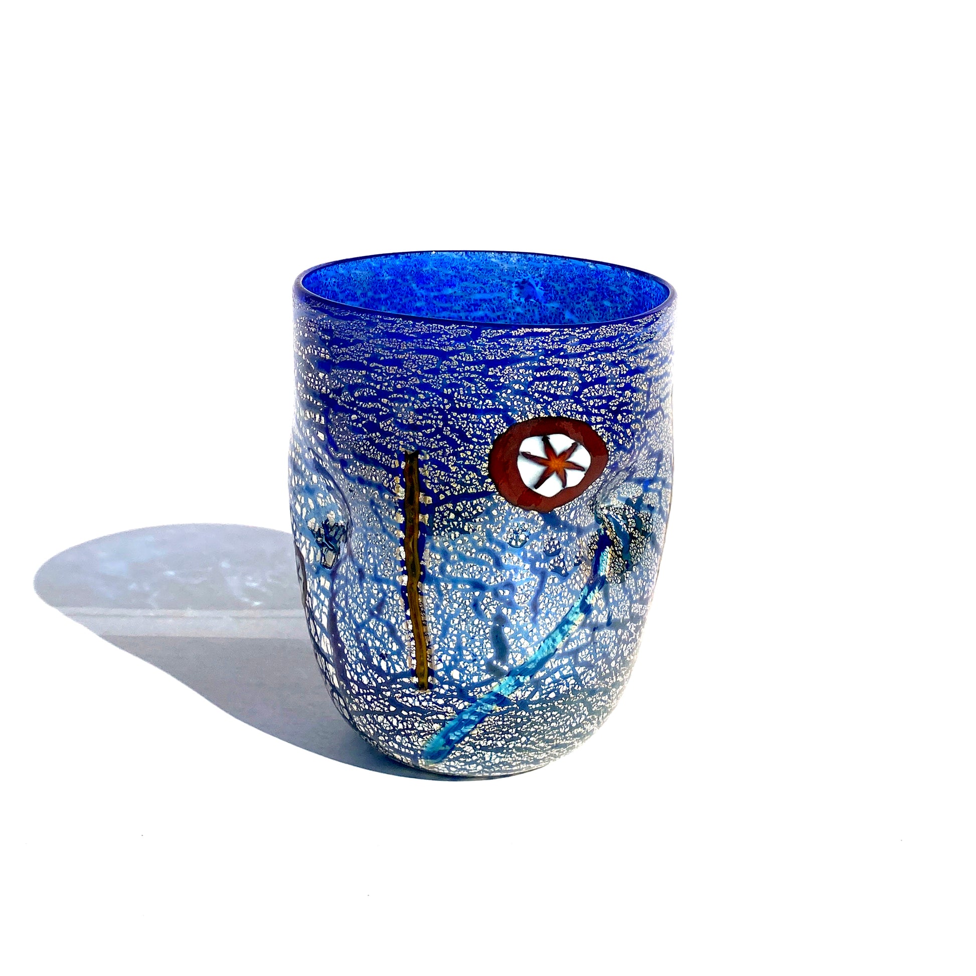 Realizzati in pregiato vetro cristallo con graniglia di vetro colorato, questi bicchieri sono arricchiti da un'applicazione di foglia d’argento che, frammentandosi delicatamente, dà vita a una costellazione di minuscoli puntini luminosi. Un effetto raffinato e poetico che rende ogni pezzo unico e affascinante.