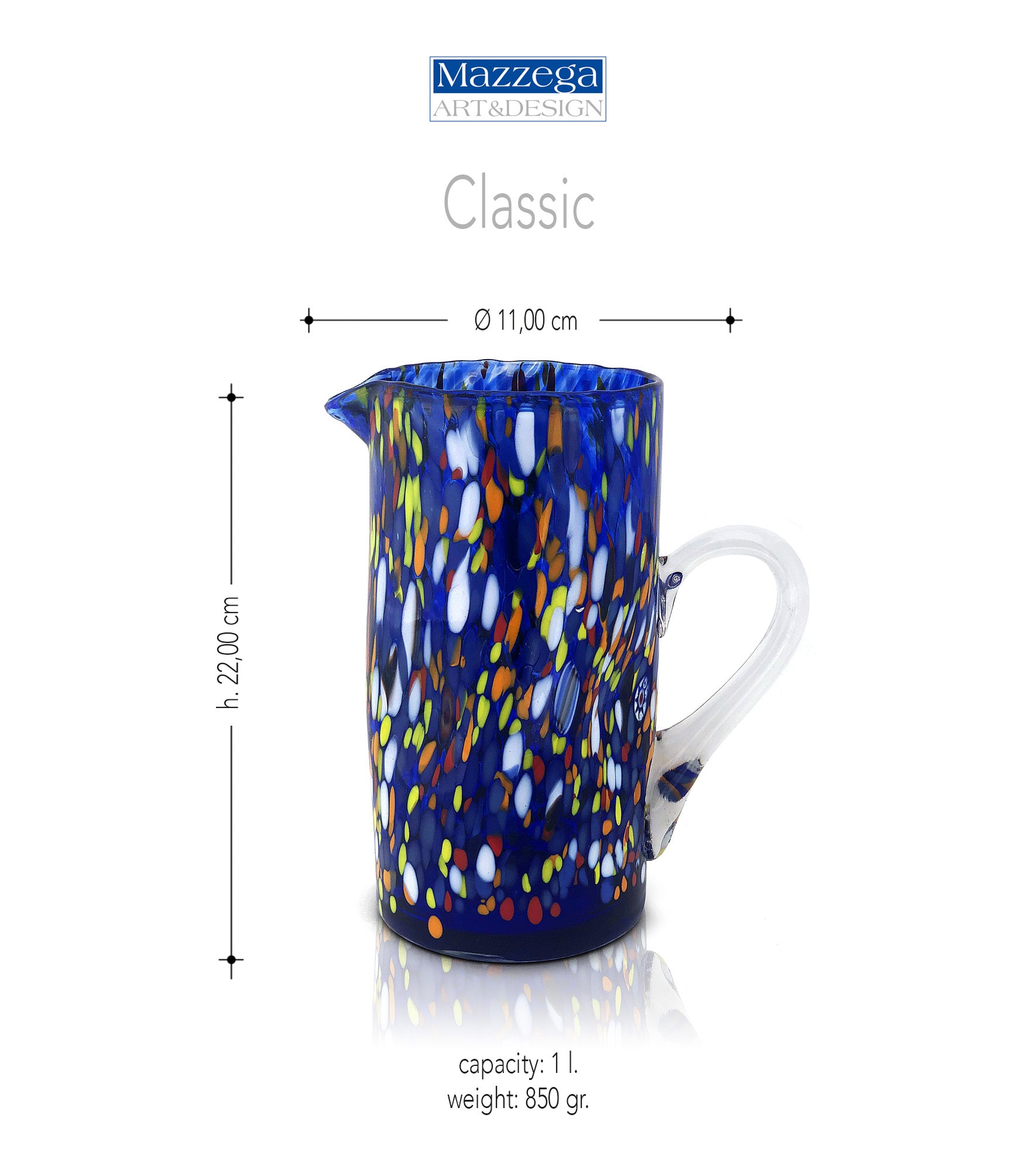 Caraffa Classic in Vetro Soffiata e Lavorata a Mano con Murrine di Murano, linea “I Colori di Murano” 1000 ml. Made in Italy