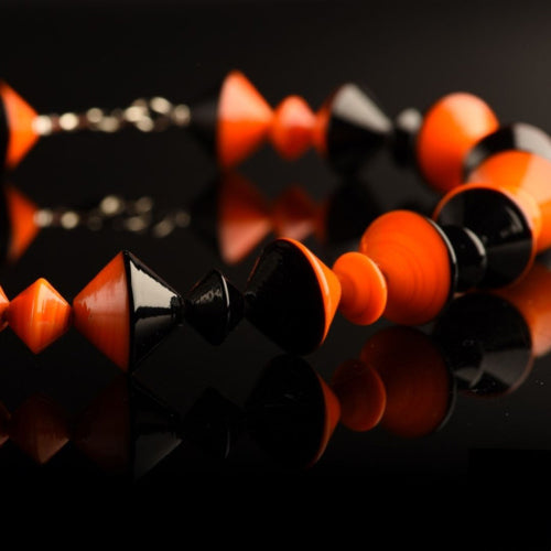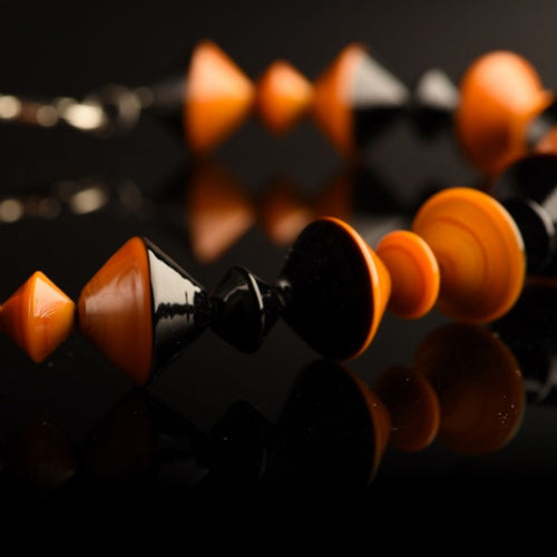 Questa splendida collana è caratterizzata da eleganti perle biconiche bicolori satinate da 16 mm, realizzate una per una con la raffinata tecnica delle perle a lume. È proprio questo processo artigianale meticoloso che conferisce alle perle quella lucentezza satinata unica, che emana raffinatezza e fascino ad ogni movimento.